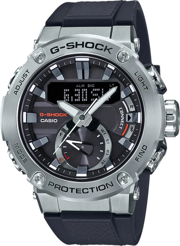 Carbon Core Guard Structure. The inner case is made of fine resin that incorporates carbon fiber for light weight along with rigidity that is superior to that of resin. This material protects the internal module from shock-induced damage and deformation. The outer case is made of stainless steel. The dual back cover protects the back surface against impact. The smaller case of the GSTB200 series provides a comfortable fit, even though the watch is equipped with a wide face. The light-on-dark LCD contributes to both functionality and face design.