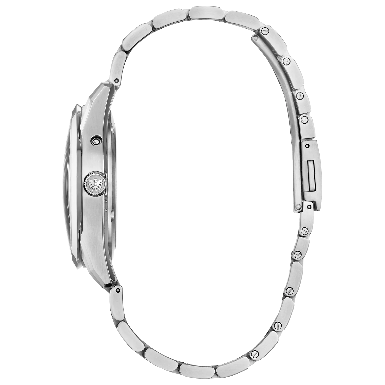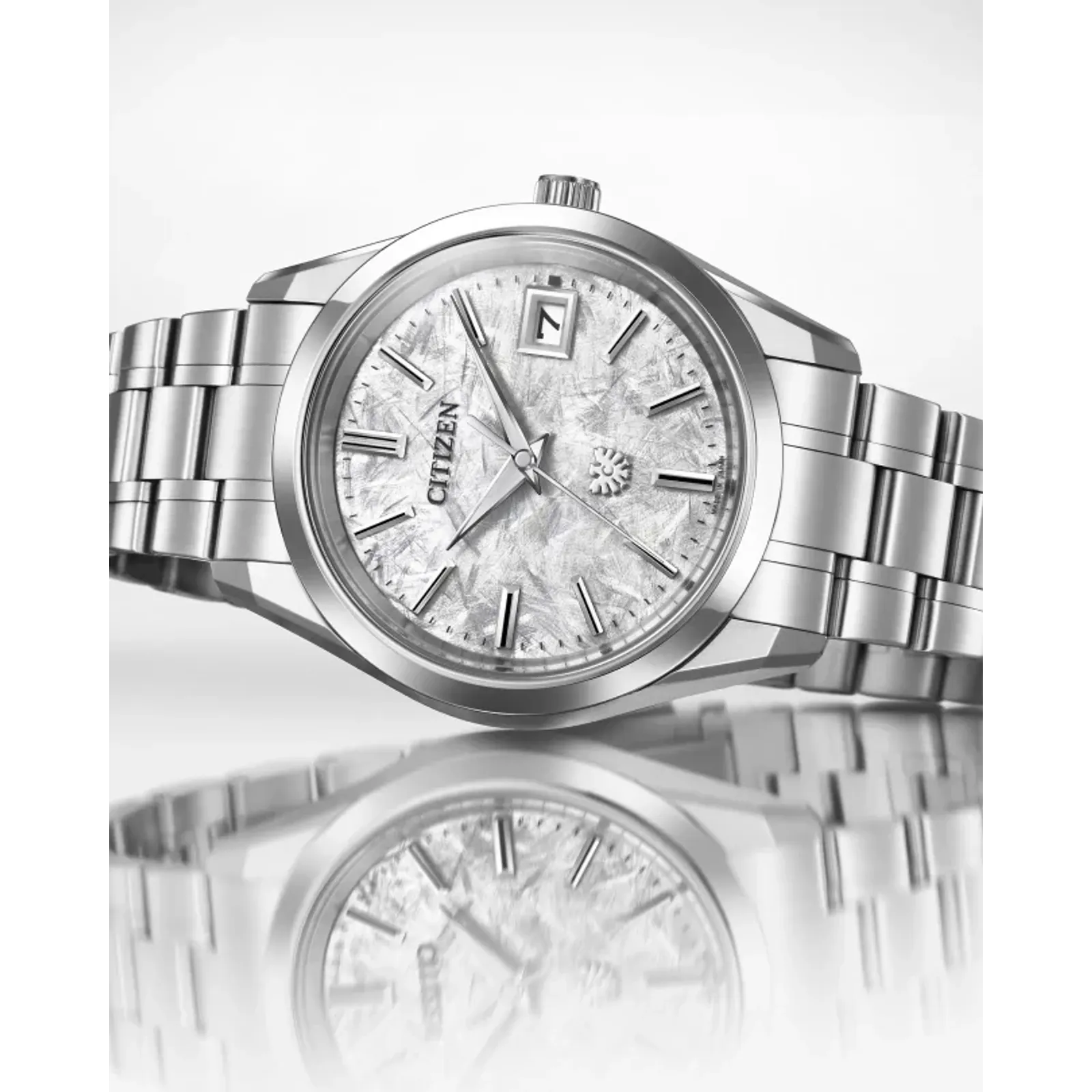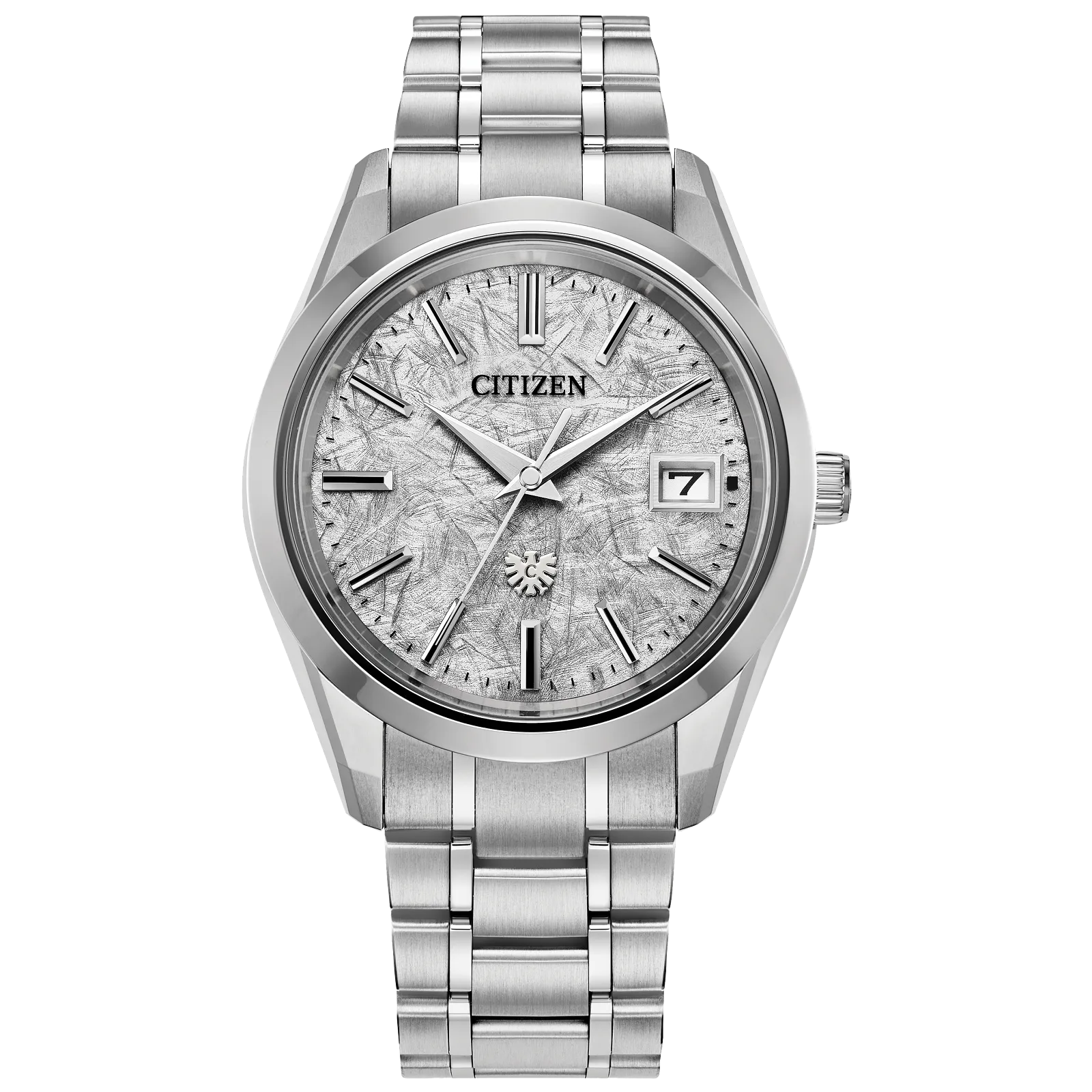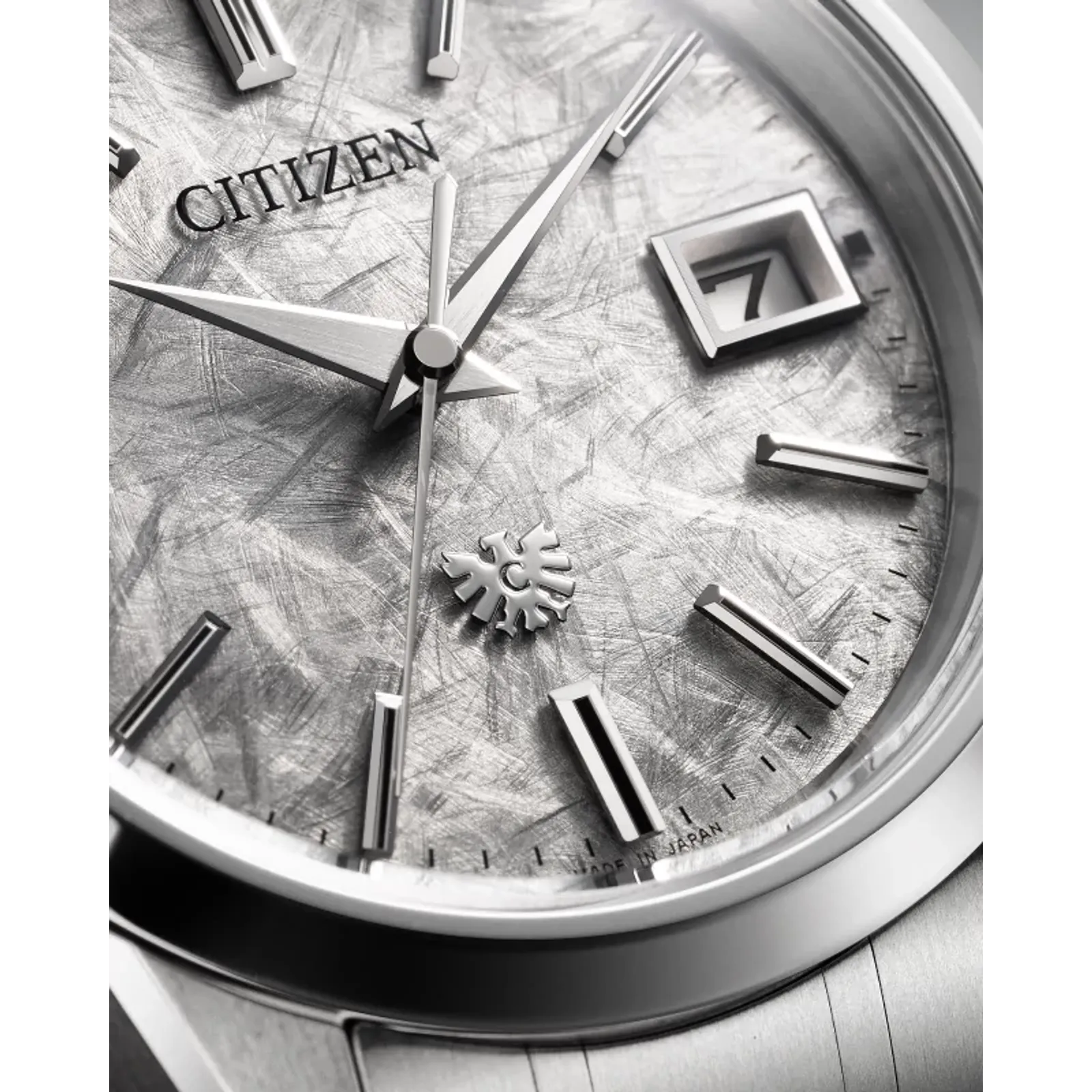 On the wrist, the watch measures comfortably at 38.3mm, with its silver-tone Super Titanium™ case that's lightweight, scratch- and rust-resistant, and faceted with sharp surfaces of brushed and polished finishing and secured via a matching triple-link bracelet. A dual-sphere sapphire crystal protects a unique silver-tone dial with an eagle feather pattern, creating a captivating interplay between light, texture, and color. Towards the bottom of the display is an eagle mark, symbolizing the twin ideals of The CITIZEN - foresight and dedication to the pursuit of ideals, as well as the enduring connection between watch and wearer.