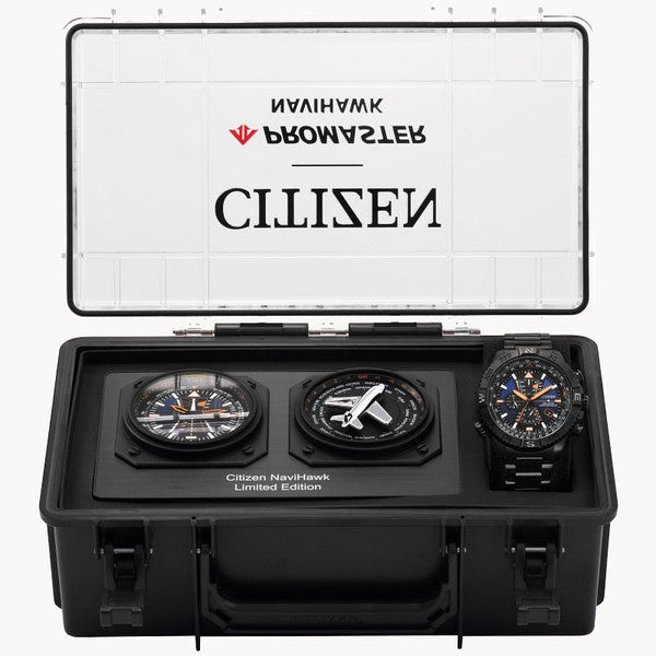 From the Citizen Eco-Drive® Promaster Navihawk A-T Collection, this men's limited edition set features a watch with a blue dial, luminous hands and markers, 3 chronograph sub-dials, a date display at the 4 o'clock hour, with a compass bezel and sapphire crystal in a 48.0mm black ion-plated stainless steel case. The quartz movement keeps you right on time and the Citizen Eco-Drive® technology harnesses the power of light so it never needs a new battery. A pilot's dream, this set comes in a collector's box that includes 2 clocks - one with local time - and the other with world time (24 world cities/time zones). The black ion-plated stainless steel bracelet secures with a fold-over clasp. Water-resistant to 200 meters.