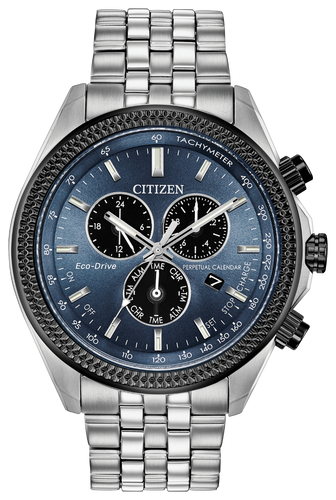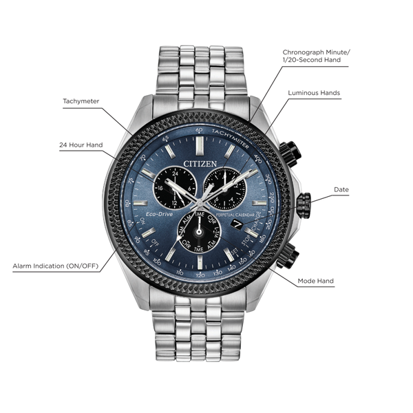 Taking it up a notch with the reinvented Citizen Perpetual Calendar Chrono timepiece with a 1/20 second chronograph, perpetual calendar and dual time in a stainless steel case and bracelet completed with a blue-gray dial. Featuring our Eco-Drive technology - powered by light, any light. Never needs a battery. Caliber number E820.