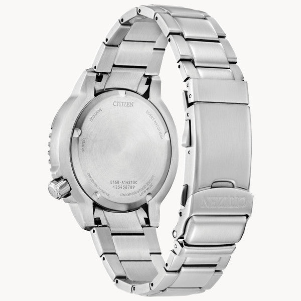 Submerge yourself in the latest Dive watch to join Citizen's innovative Promaster line. The robust 44mm silver-tone stainless steel exterior has an easy-grip dive bezel and crown at 4 o'clock, with the monochromatic design secured to the wrist via a matching silver-tone stainless steel bracelet. The sunray-textured, light blue dial features oversized hands and applied markers that add to its high legibility, while accents of a bright luminous material ensure high legibility to even the deepest depths. At the 4 o'clock position is a thoughtful date window, adding another element of functionality to this built-tough diver. Maintaining the robust standards of the Promaster Collection, the timepiece is water resistant up to 200 meters. Powered by Citizen's proprietary Eco-Drive technology to provide light-powered vitality continuously and sustainably without ever needing a battery. Caliber E168.