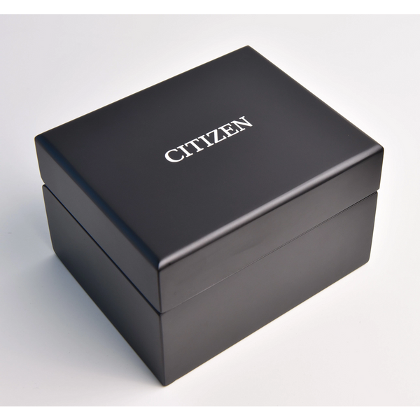 Beneath a sapphire crystal, a lunar-inspired background plays host to a vertical-configured chronograph display, with a 6 o'clock moonphase and a 4 o'clock date window balancing technological utility with intrigue for the eye. Powered by Citizen's famed Eco-Drive technology to provide light-powered vitality without ever needing a battery, the watch makes use of Citizen's proprietary new Luna Program- the world's first fully automatic analog moon phase function for light-powered analog wristwatches. Water resistant up to 100 meters. Caliber H874.