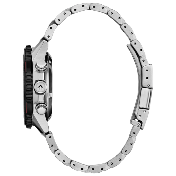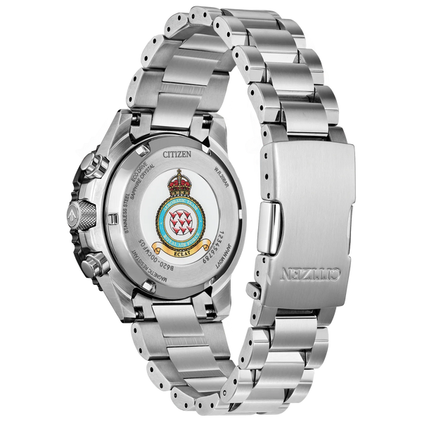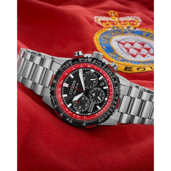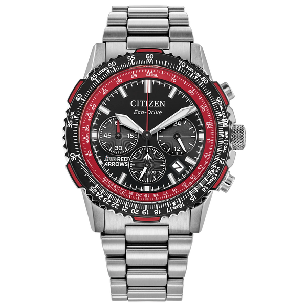 On the wrist, the watch's silver-tone stainless steel case measures 40mm in diameter, wearing boldly with its sharp faceting and satin finishing, while a slide-rule scale on the bidirectional black and red ion-plated bezel provides additional flight utility. A triple-link stainless steel bracelet secures the timepiece. On the dial, a Red Arrows colorway with white accents adds to the watch's superior legibility, while a sapphire crystal and 200m of water resistance protect it all. Functions include a 1/5 second chronograph measuring up to 60 minutes, 12/24 hour time displays, and a date indicator. The movement is protected via a Red Arrows' insignia-signed case back, and is powered by our proprietary Eco-Drive technology - sustainably powered by light and never needing a battery. Caliber B620.