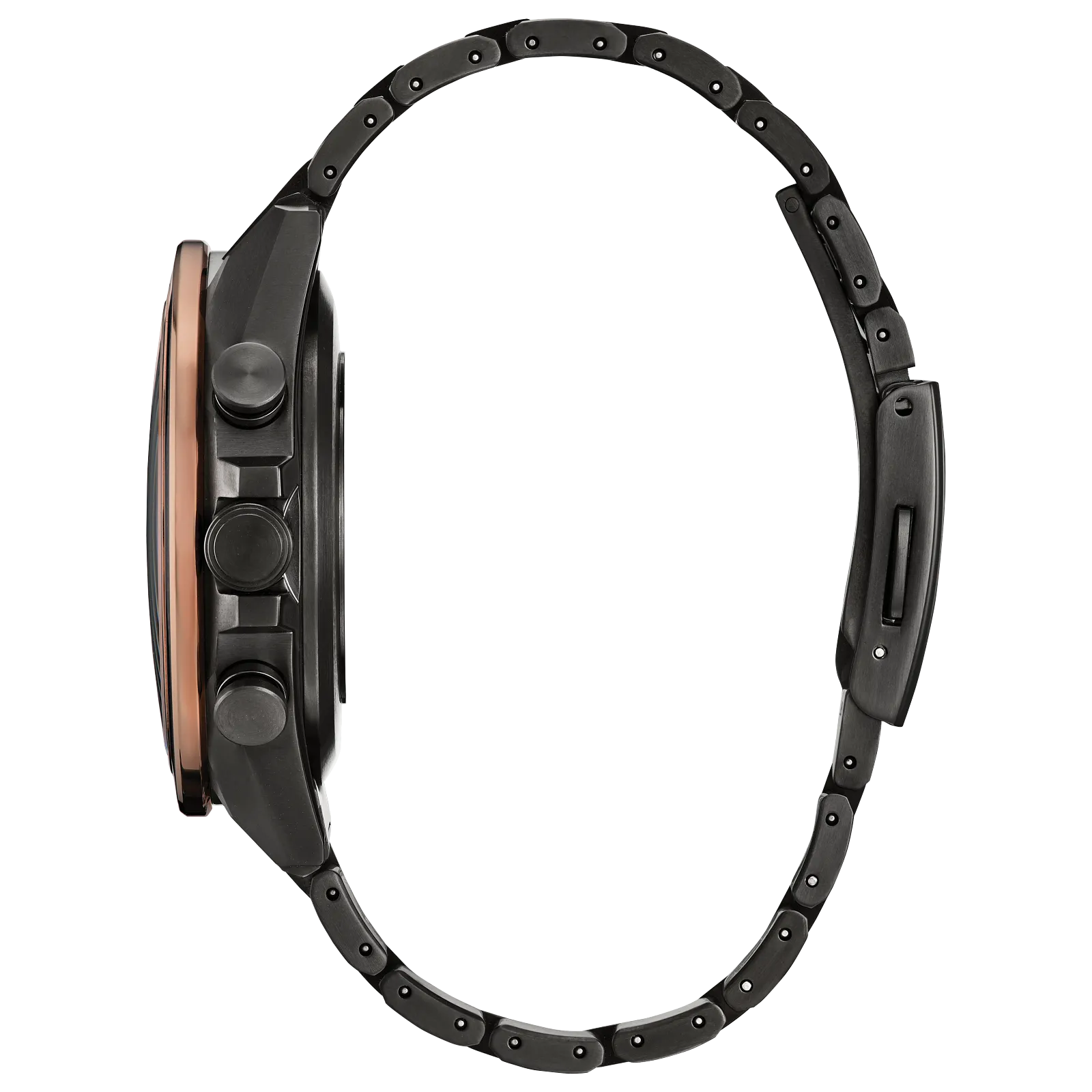 Other advanced features include world time in 27 cities (40 time zones), a 1/20 second chronograph, dual time zones, (UTC) universal coordinated time display, a perpetual calendar, as well as daylight savings time, and power reserve and light level indicators. This model features the most advanced movement for Eco-Drive Satellite Wave GPS watches, and delivers the world's fastest time-only signal reception in as little as 3 seconds. The ultra scratch-resistant Attesa is powered by Citizen's proprietary Eco-Drive technology, so it never needs a battery. Water resistant up to 100 meters. Caliber F950.