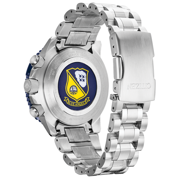 Case Features: Promaster Crown; The Blue Angels insignia replicated on the caseback; Blue ion-plated bezel; Pilot’s rotating slide rule bezel