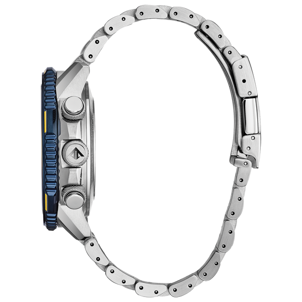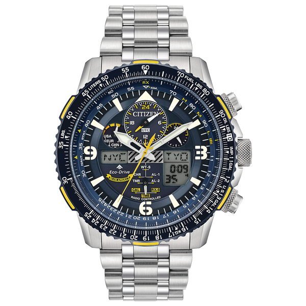 The Blue Angels are the Navy's elite flight demonstration squadron renowned for their precision and grace showcased in each of their flight maneuvers. This precision and grace is exhibited in the CITIZEN Promaster Blue Angels Skyhawk A-T with precise atomic timekeeping in 43 cities. Other features include a chronograph, perpetual calendar, dual time, alarms, countdown timer, digital backlight and UTC display, power reserve and pilot's rotating slide rule bezel. This model appears in a stainless steel case and bracelet, yellow accented dark blue dial and bezel with the Blue Angel's insignia replicated on the caseback. Featuring our Eco-Drive technology - powered by light, any light. Never needs a battery. Caliber number U680.