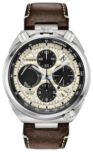 Paying homage to a retro 1973 CITIZEN Bullhead model, the newly modernized 100th Anniversary CITIZEN Limited Edition Tsuno Chrono Racer showcases a unique case styling, trendy color combinations and is sure to stand out on your wrist. A hand assembled movement, the Tsuno Chrono Racer features 1/5-second chrono, alarm, tachymeter, instantaneous fly back, power reserve and date. Seen here in a black ion-plated stainless steel case and bracelet and black dial with gold-tone accents. Featuring our Eco-Drive technology – powered by light, any light. Never needs a battery. Caliber number E210.