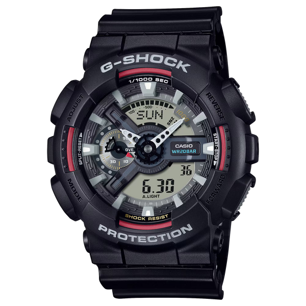 A stand-out with distinctive large case. The original color scheme is faithfully reproduced with touches of G-SHOCK red, representing the passion to take on challenges; blue, symbolizing excellent water resistance; and yellow, signifying outstanding shock resistance.