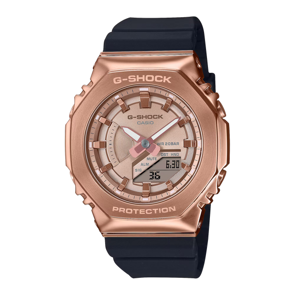 Go slim, clean and bold with a mid-sized black resin band GMS2100PG1A4 in a metal-clad octagonal take on the original iconic design.