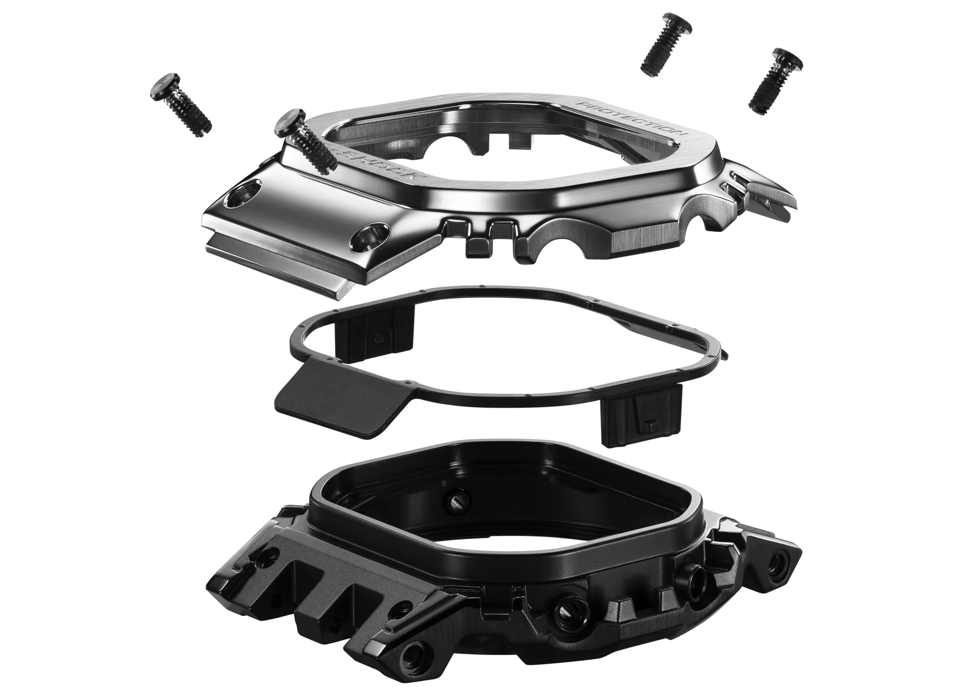 We kept the iconic form of the original G-SHOCK, while developing a new structure that extends the case all the way to the lugs to even further mitigate shock transmission. The intricate, modern shape, seen from the side, highlights the design's structural beauty. An internal protector made of resilient resin temporarily deforms to absorb shocks, achieving a timepiece with a full-metal exterior that meets G-SHOCK shock-resistance standards. The stainless-steel case employs a screw-lock case back to ensure a tight seal.