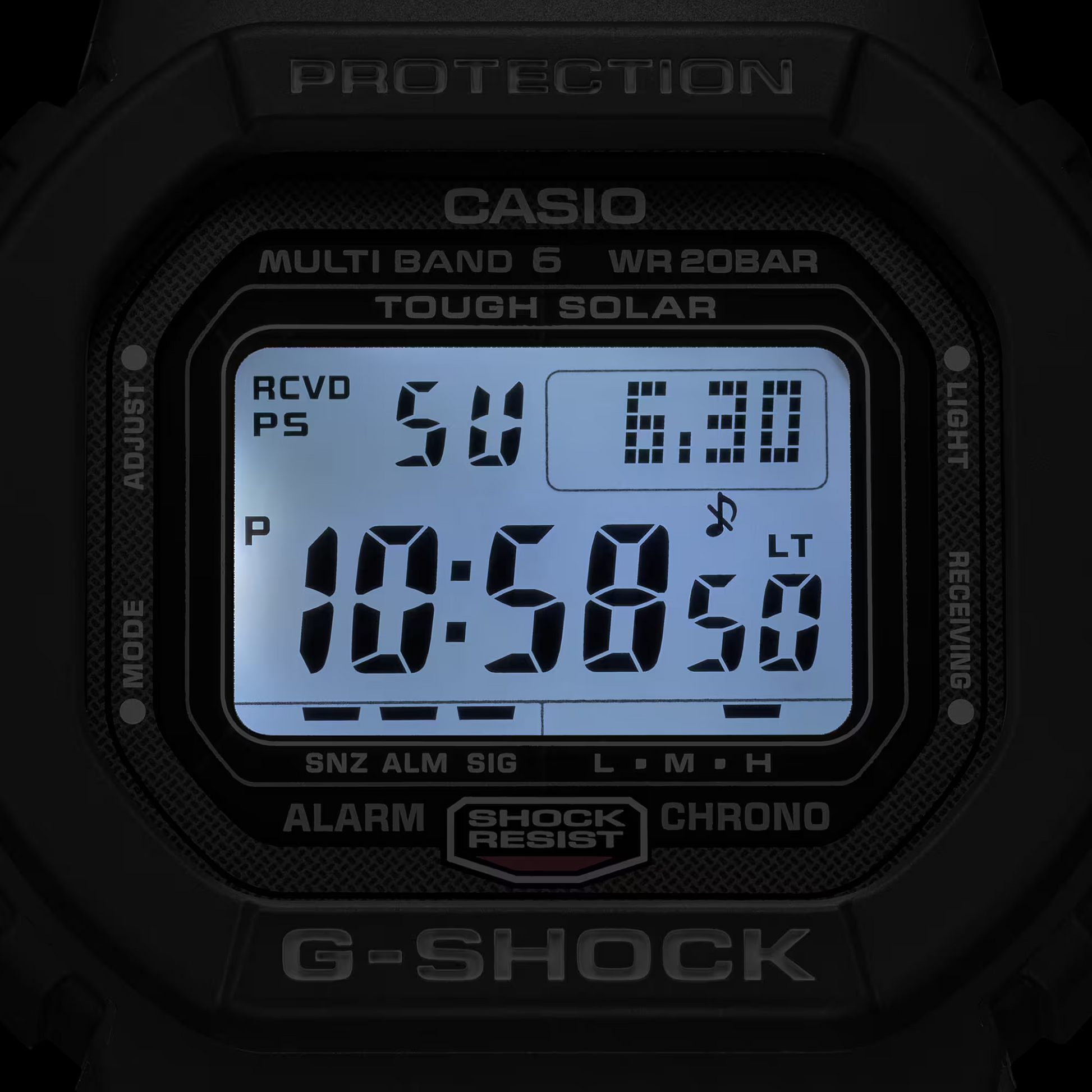 Pursuing further toughness while inheriting the DNA of the first G-SHOCK model (DW5000) the GW5000U-1 is constructed with a solid metal case and a screw back. This timepiece is also equipped with advanced technology, Multi-Band 6 that receives standard radio waves from 6 stations around the world. The metal case and screw back are made of DLC (diamond-like) to enhance wear resistance, and the screw back is also mirror-processed to create a luxurious finish. In addition, the resin band uses soft urethane that is comfortable to wear. Evolved from the G-SHOCK original design that was born in 1983, the GW5000U-1 is a discerning model that boasts technology and a high-quality finish.