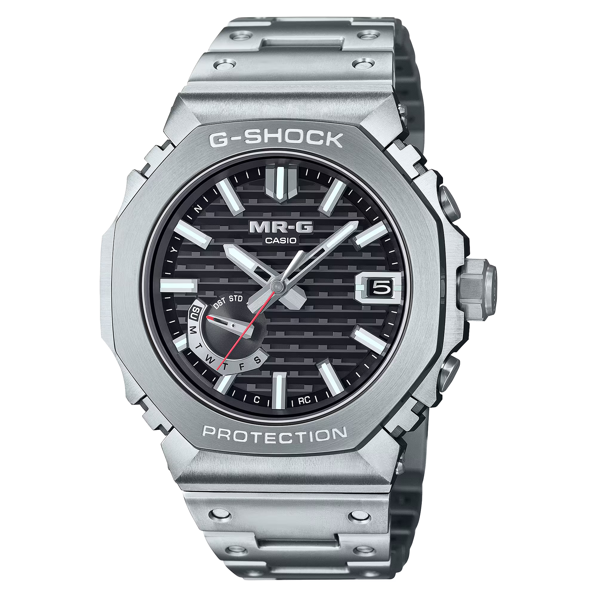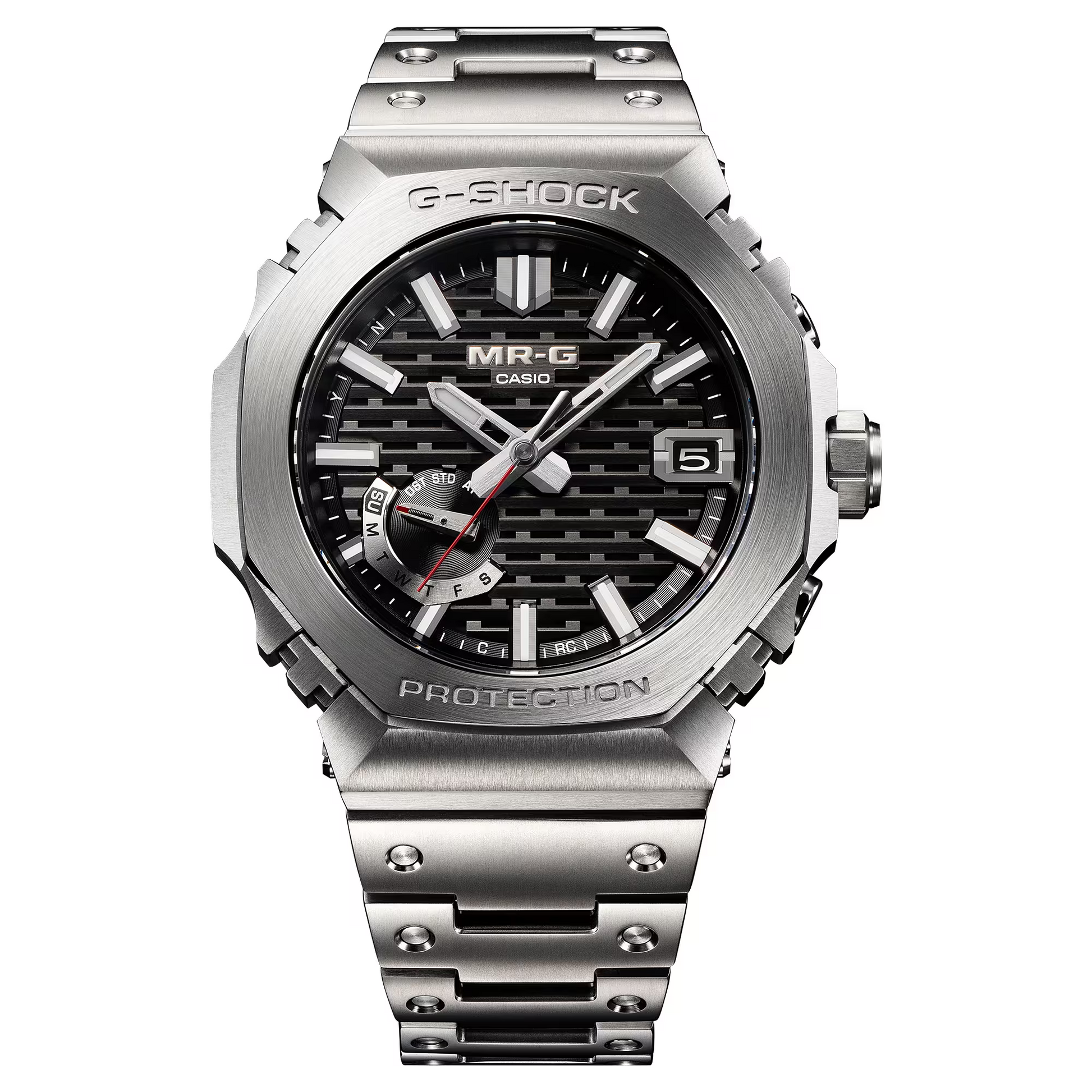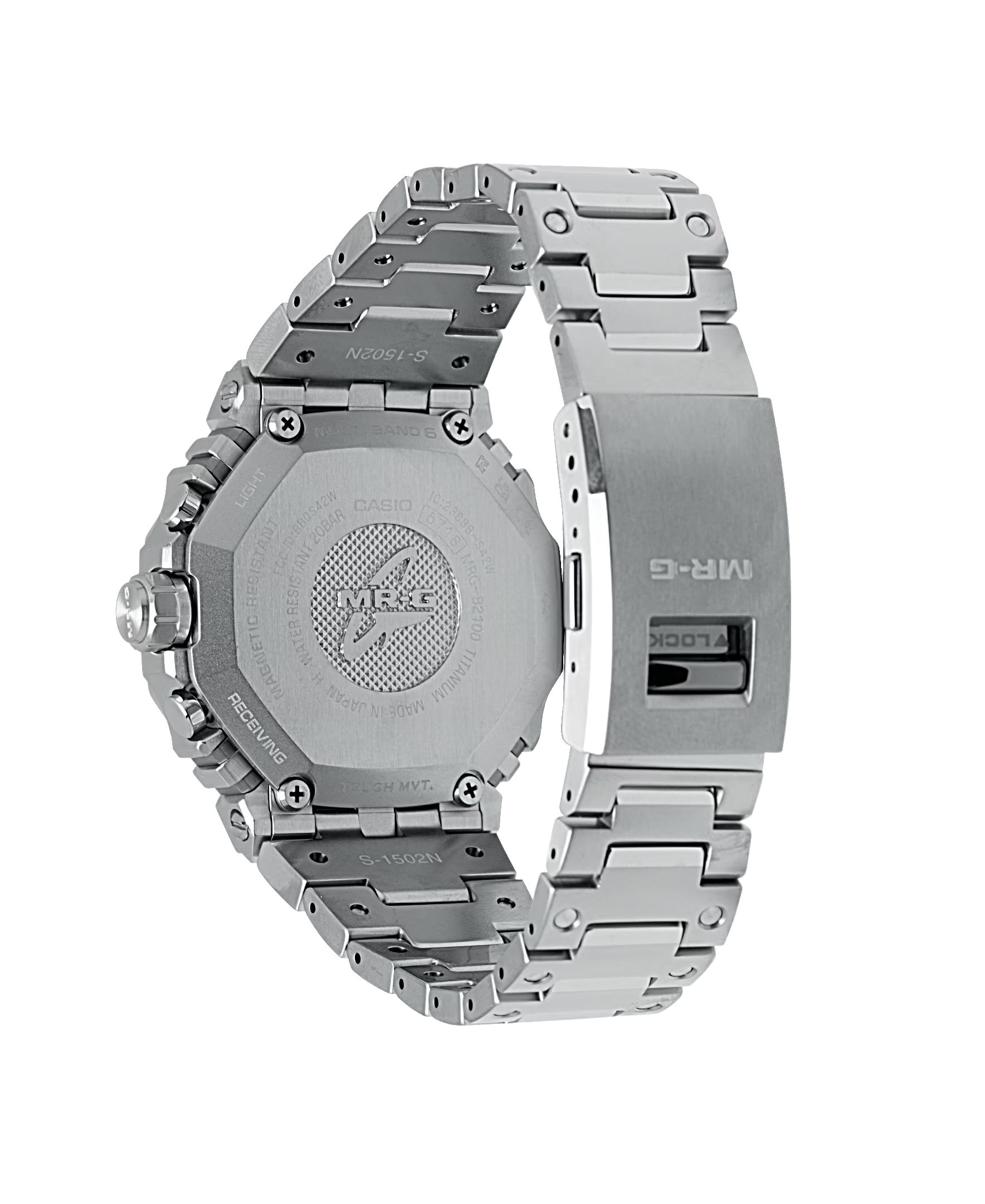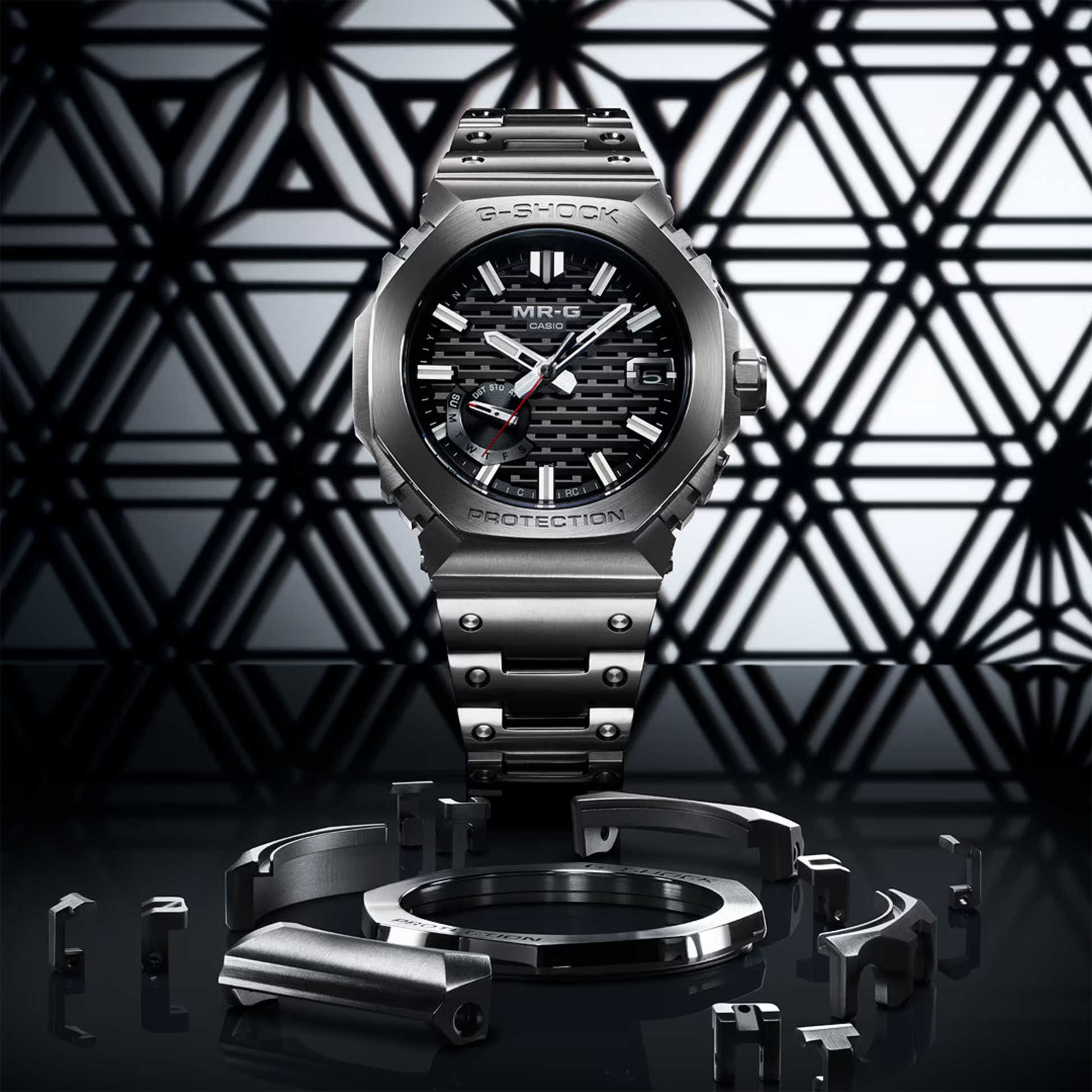 The bezel alone consists of 27 different components in an intricate construction unique to G-SHOCK shock-resistant performance. Every single one is individually and meticulously polished to achieve a stunningly detailed textural appearance. The state-of-the-art Multi-Guard Structure incorporates buffers between the parts to ensure outstanding shock absorption and protects the dedicated MR-G module with a gold-plated retainer plate.