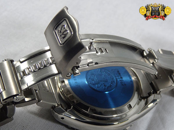 Buckle Titanium and stainless steel with three-hold clasp with secure lock, push button release and diver adjuster