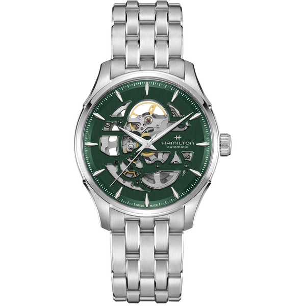 Seamlessly blending tradition with innovation, the Jazzmaster Skeleton 40mm offers a glimpse of its Swiss automatic movement in action. Set in striking Empire green, the open-worked dial reveals the automatic H-10-S movement, featuring 25 jewels and an impressive 80-hour power reserve. This iconic timepiece is paired with a sleek stainless steel metal bracelet, exuding both modern dynamism and timeless appeal.