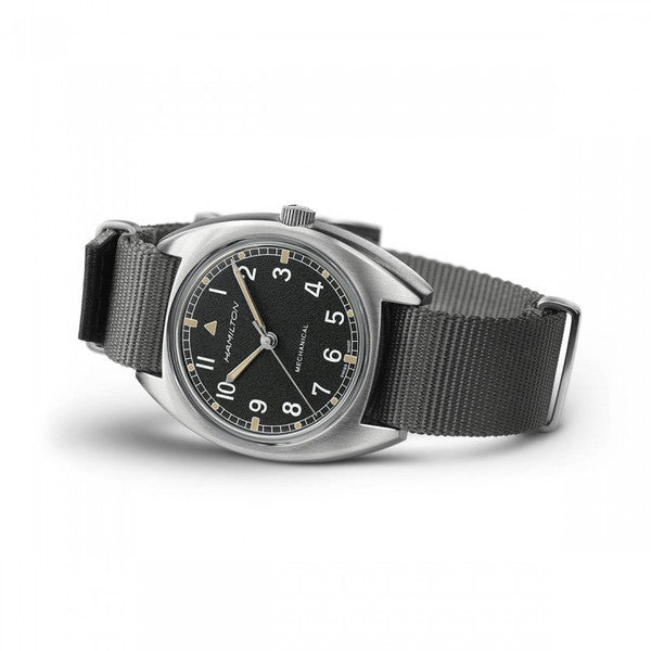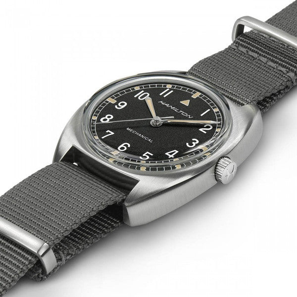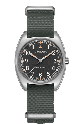 Powered by the awesome H-50 hand-winding movement with 80 hours of power reserve, the Khaki Pilot Pioneer is a reinterpretation of a vintage military watch produced for the British Royal Air Force in 1973. Featuring a distinctive dial pattern and robust NATO strap, this is a military watch with real character.