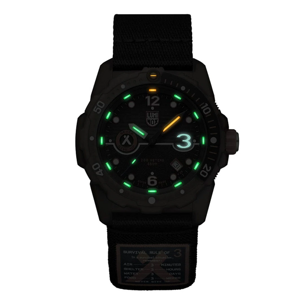 Luminox Bear Grylls goes survival mode. Luminox Bear Grylls Rule of 3 case is 42 mm and made of durable, eco-friendly, #tide upcycled plastic. This version comes with black dial and strap with removable, slidable rules of 3 table, and the Grylls signature range crown ring with water resistance to 200 meters.