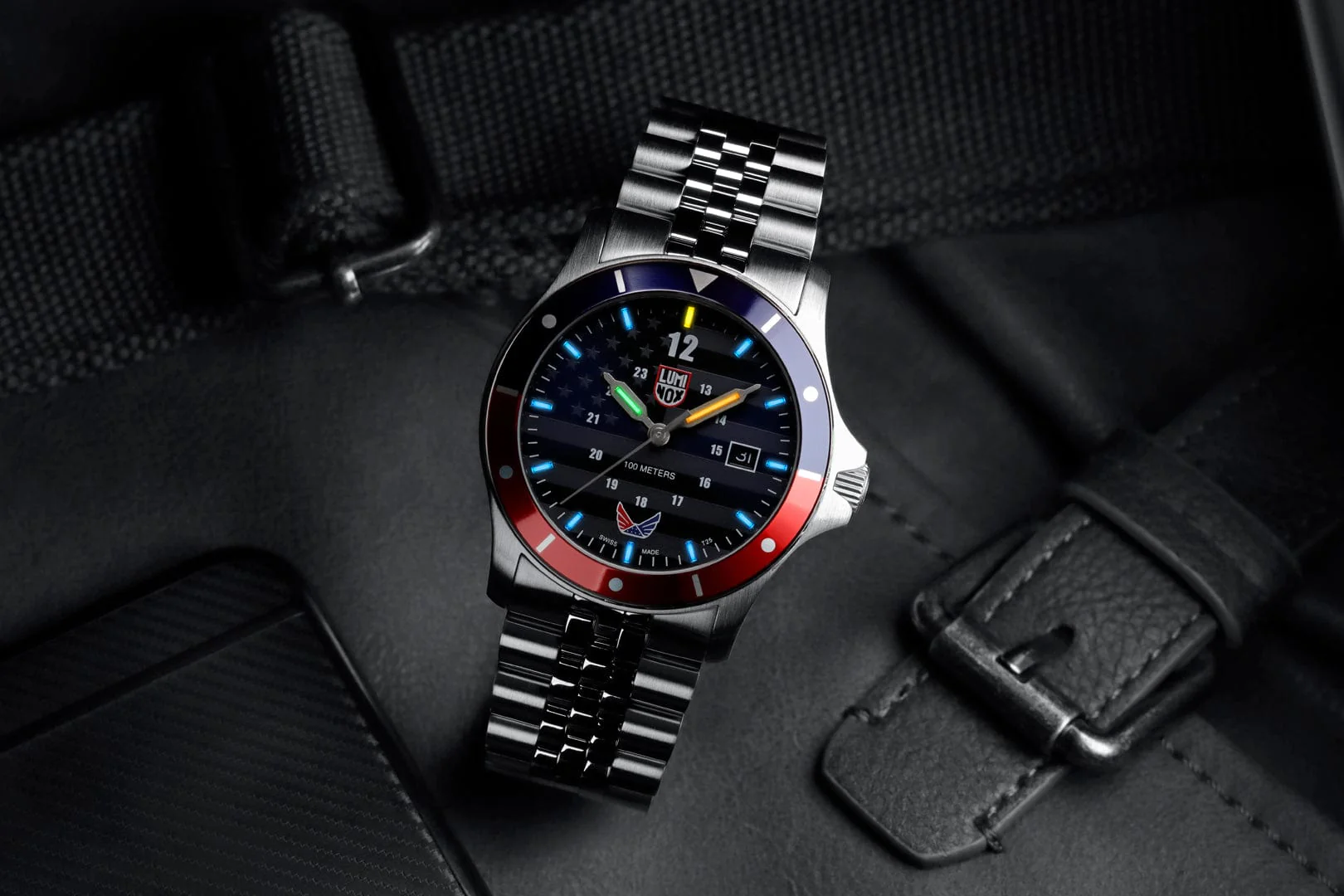 The Luminox x VOLITION AMERICA Minuteman Watch combines authentic patriotism with a sporty look. This handsome watch's striking red, white, and blue fixed bezel pairs handsomely with the eye-catching blue dial, featuring a day date display and is finished with an American Flag pattern to give this special timepiece its patriotic flair. Luminox and VOLITION AMERICA partner to benefit a greater purpose: with each watch sold, a portion of proceeds benefit Folds of Honor - a nonprofit organization that supports families and spouses of fallen or disabled military heroes through educational scholarships.