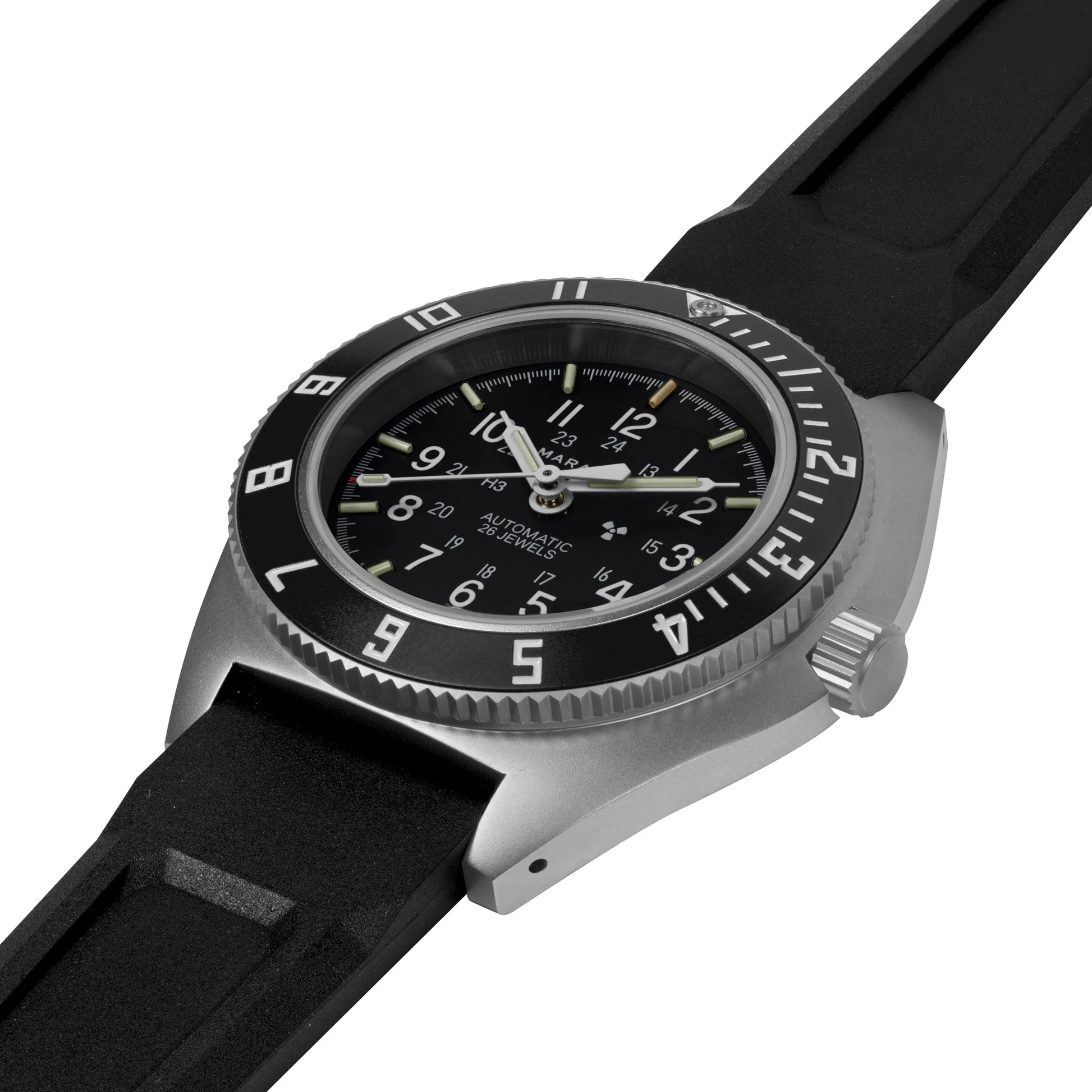 The 41mm Steel Navigator w/ Date Automatic (SSNAV-D AUTO) is the first ever Steel Navigator to feature a self-winding automatic movement. Packed with Swiss-precision and reliability, the SSNAV-D Auto is developed for pilots and everyday adventurers. The watch represents the continued lineage of Marathon's original Steel Navigator, developed in partnership with the Kelly Air Force Base in 1986. Includes 3-Piece Rubber Strap Kit.