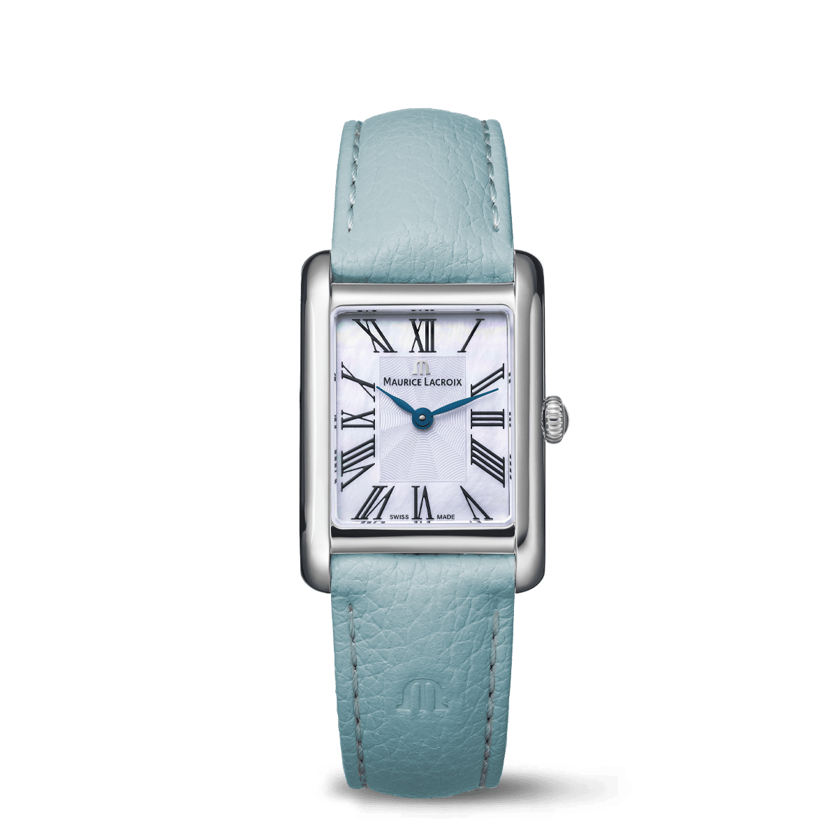 Bracelet/Strap: Light blue leather strap, featuring the Maurice Lacroix 'm' logo
