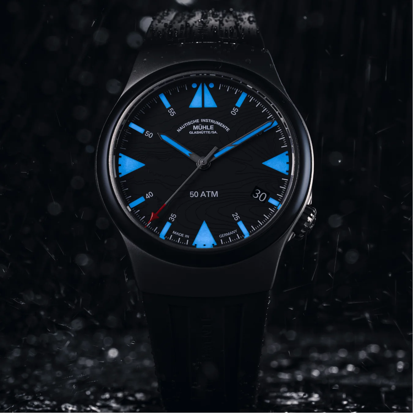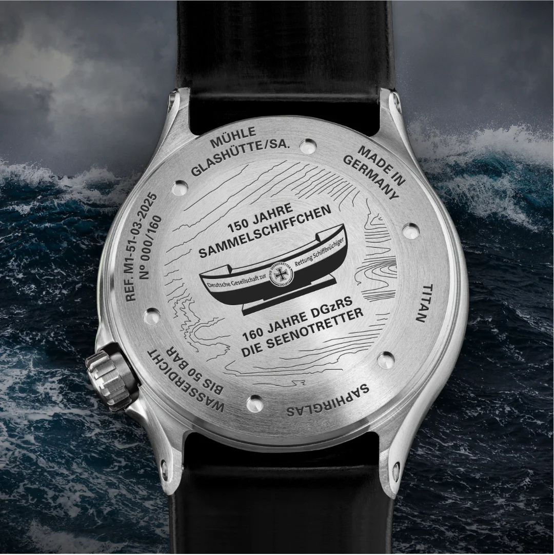 A powerful symbol of courage, dedication and independence: the S.A.R. Mission-Timer "160 years DGzRS" honors two big anniversaries of the German Maritime Search and Rescue Service (DGzRS) with its titanium grey dial showing sea topography, a bright red tip on the seconds hand, and a special engraving on the back. Limited to just 160 pieces, this special edition combines top-notch functionality with maritime symbolism - bringing the spirit and values of the sea rescuers on the North and Baltic Seas right to your wrist. For every watch sold, Mühle-Glashütte donates 100 euros to the German Maritime Search and Rescue Service (DGzRS).