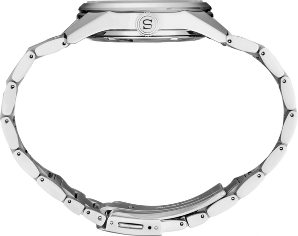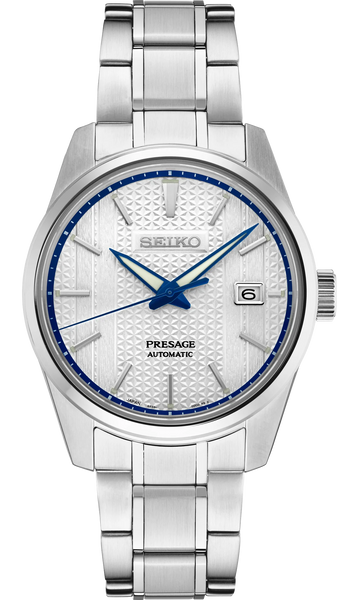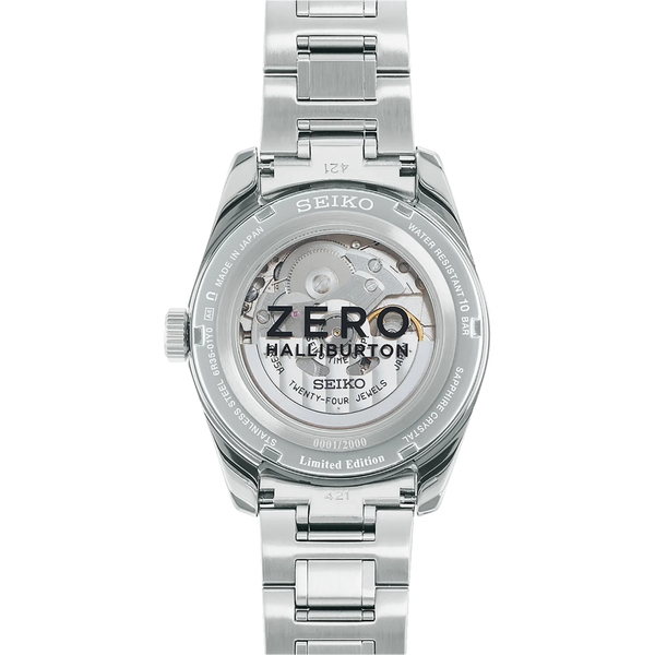 Presage Sharp-Edged Series GMT Zero Halliburton Limited Edition. Offering the finest in Japanese mechanical watchmaking, the Presage Collection blends precision technology with superior craftsmanship and design. The cool angularity of the Sharp-Edged Series, celebrating the fresh look of contemporary Japanese design, provides a perfect match for its first collaborative collection, a Limited Edition group designed with the iconic Zero Halliburton luggage brand. With clean functionality and graceful lines, the aluminum travel cases of Zero Halliburton, first established in 1938, have gained an enthusiastic worldwide following. Created with the blend of practicality and style characteristic of both brands, the new Limited Editions feature a distinctive dial pattern combining Zero Halliburton's double-rib design and the Presage Sharp-Edged Series' Asanoha hemp-leaf motif, a symbol of growth and prosperity dating to the Heian Period (794-1185 AD). Available only in a limited edition of 2,000, with the Zero Halliburton logo on each screw-down, see-through caseback, this exceptional watch is crafted of stainless steel, with super hard coating for enhanced scratch-resistance. The 24-jewel automatic movement beats at a frequency of 21,600 vibrations per hour, with a power reserve of approximately 70 hours and manual winding capability. The silver dial features blue accents, a date calendar and LumiBrite hands and markers, and is topped by a sapphire crystal with anti-reflective coating on the inner surface. A tri-fold push button release clasp offers secure and comfortable wear. Includes a special Limited Edition collectors' case. 10 bar, 100M Water Resistant.