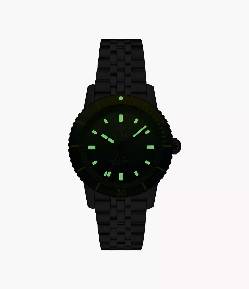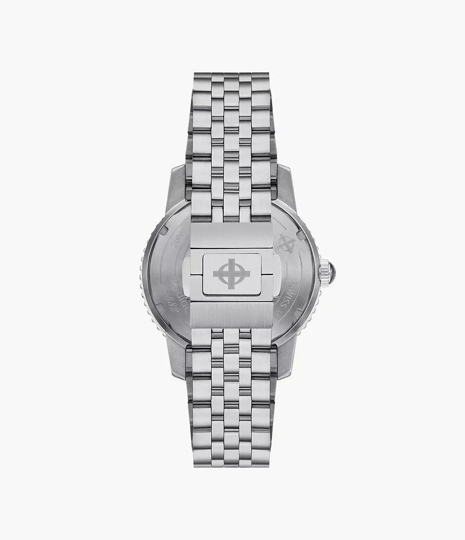 This 40mm Super Sea Wolf Compression features a stainless steel case, degrade brushed dial, STP 1-11 Swiss automatic movement with 44 hr power reserve, Super-LumiNova hands and markers, a 5-link stainless steel bracelet, additional nylon utility strap, and is water resistant to 200 meters.